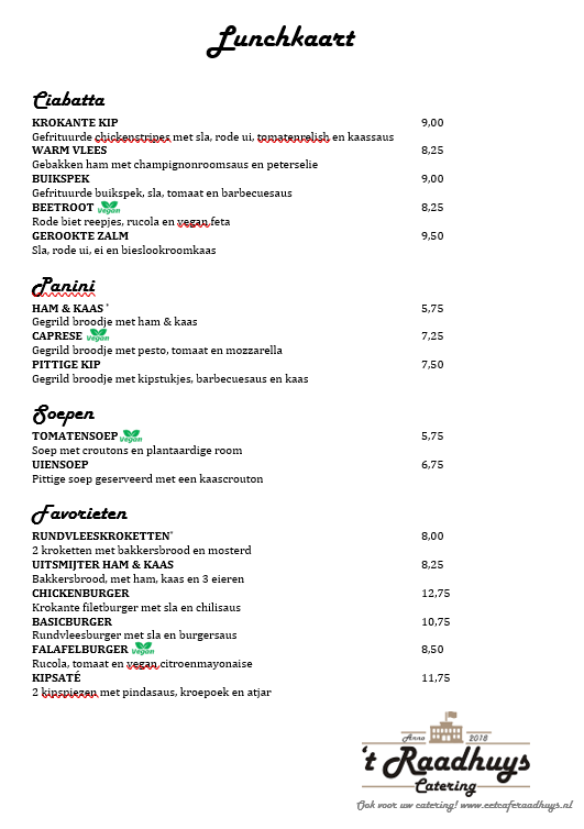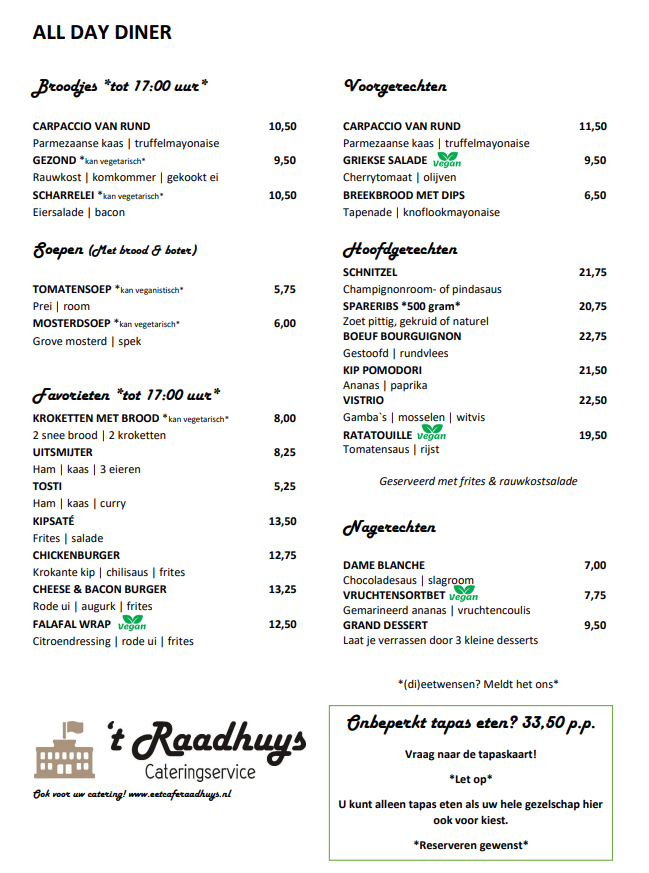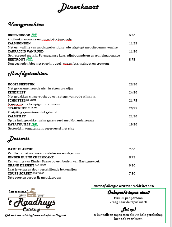 “ We hadden een vakantiewoning gehuurd in Aalten en wilde voor wat betreft het “eten” ontzorgd worden. Uiteindelijk viel onze keus op ‘t Raadhuys. De reden was omdat ‘de dienstverlening die t Raadhuys boo totaal was. De contacten over wat we wilden waren goed en geadviseerd . Op onze vragen kregen we altijd snel antwoord We bestelde voor de ochtenden ontbijt, dat zeer smakelijk en goed verzorgd was. Het avondeten was eenmaal een verrukkelijk buffet. Werkelijk prima verzorgd. De daaropvolgende avond hadden we een BBQ. Dat was helemaal top. Het vlees werd perfect gebakken door Kevin , de eigenaar van de catering. De bij behorende salades vielen ook goed in de smaak. De afgesproken tijden voor de leveringen waren altijd op de vooraf afgesproken tijdstippen. Conclusie het kon niet beter en mede door ‘t Raadhuys dienstverlening hadden we een perfect familieweekend. Dus een aanrader voor iedereen!! Doen dus!! ”